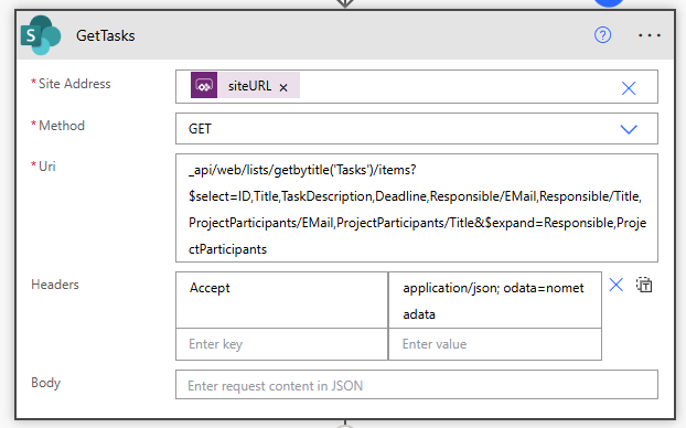 Create an Send an HTTP request to SharePoint action and rename it GetTasks