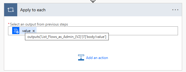 Insert an apply to each action and insert the value field from your List Flows as Admin (V2) output.