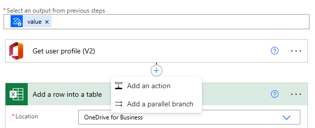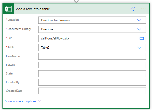 Back in Power Automate insert a new Add a row into a table action and navigate into OneDrive and the file location
