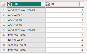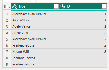 #"Grouped Rows" = Table.Group(#"Expanded Countries1", {"ID"}, {{"Group", each _, type table [Title=text, ISO=text, ID=number]}}),