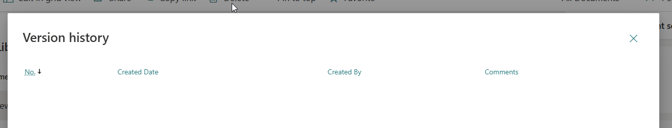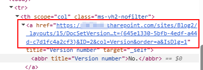 https://yourtenant.sharepoint.com/sites/Blog2/_layouts/15/DocSetVersions.aspx?list={645e1330-5bfb-4edf-a44d-c7d1fc4a2cf3}&ID=2&col=Version&order=a&IsDlg=1