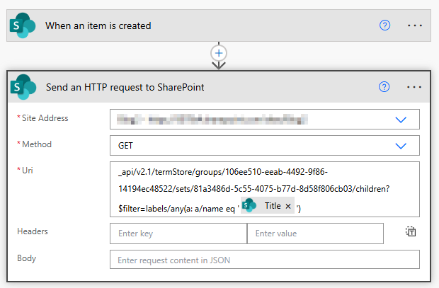 _api/v2.1/termStore/groups/106ee510-eeab-4492-9f86-14194ec48522/sets/81a3486d-5c55-4075-b77d-8d58f806cb03/children?$filter=labels/any(a: a/name eq '@{triggerBody()?['Title']}')